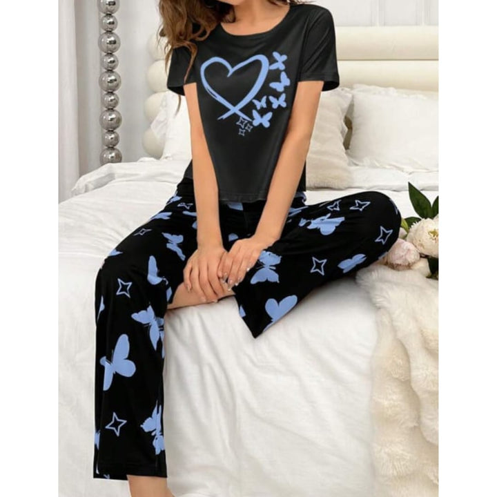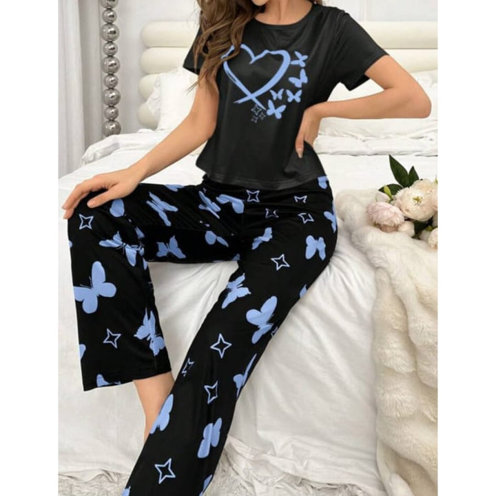 Black With Blue Butterflies Heart Printed T-shirt And Butterflies Printed Trouser Suit (AA-182)