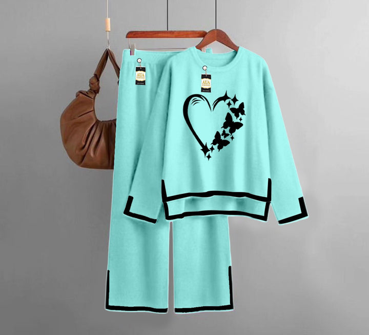 Butterfly Heart Printed Turkish Winter Co-Ord Set for Women - Warm & Stylish Loungewear Sky Blue