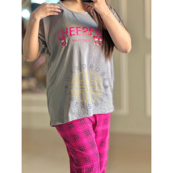 Grey Cheerful with Red Cheq Printed Casual PJ Set For Her