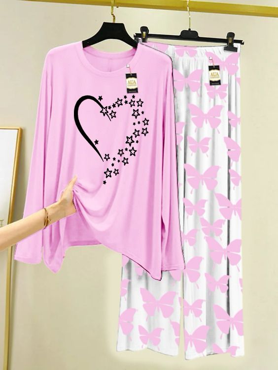 Women's New Pink Heart Design Jersey Nightwear – Soft & Stylish Sleepwear