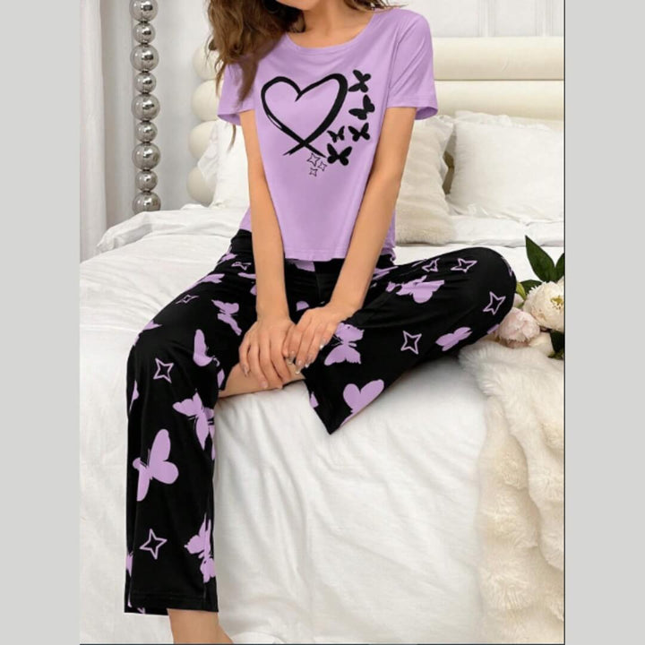 Lilac with Black Heart Butterfly Printed PJ Set For Her