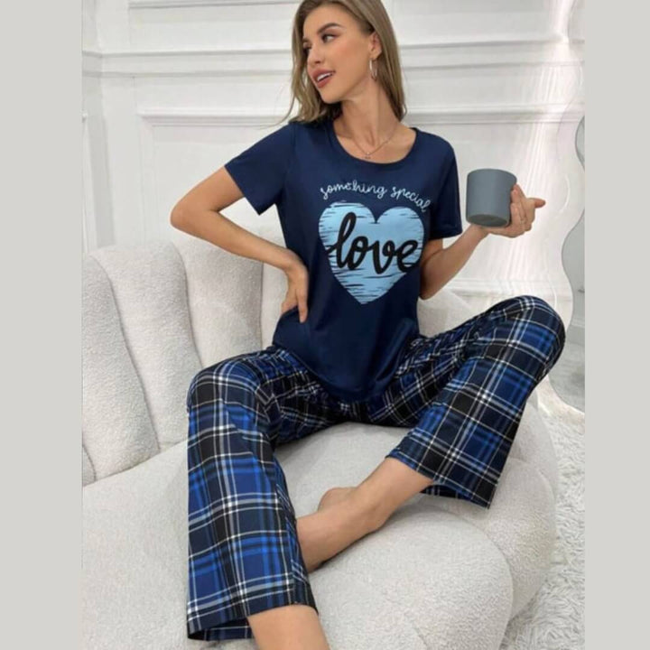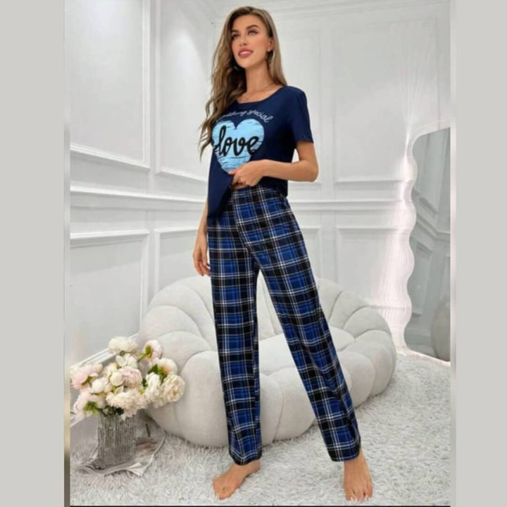 Navy Blue Love Heart with Cheq Printed PJ Set For Her