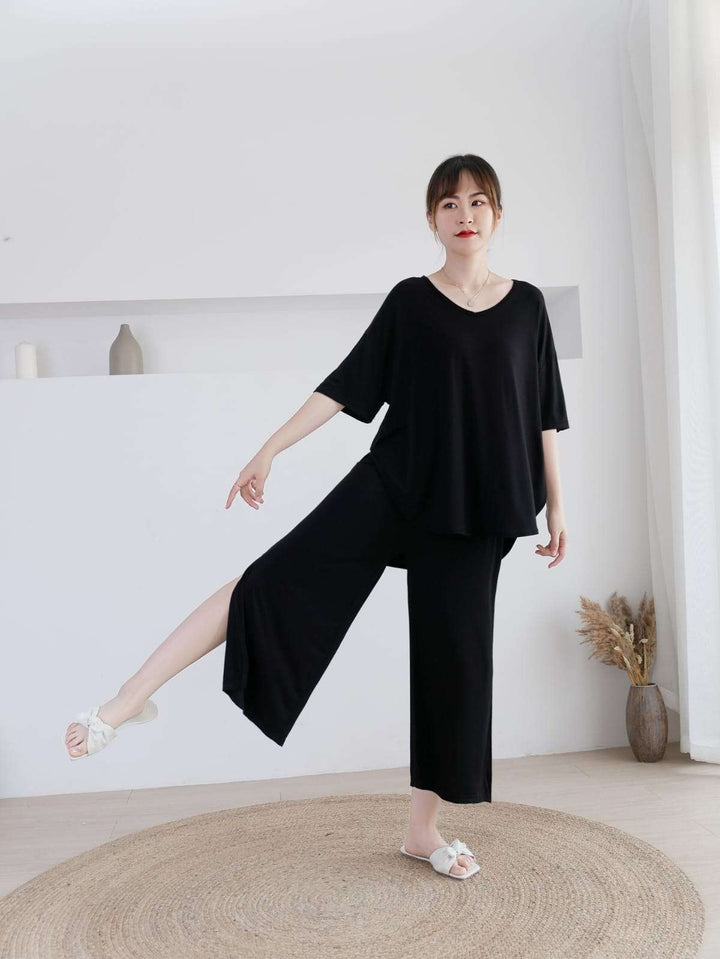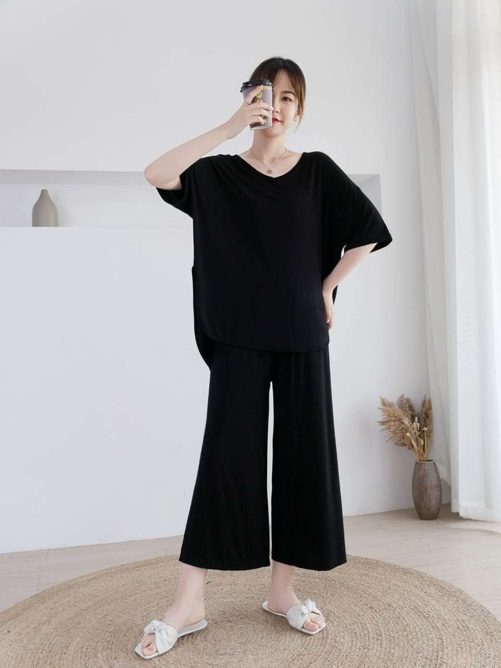 - Product Name : Plain Black V Neck Quarter Sleeves with Cut Style Pajama Night Suit for Her (AA-82)