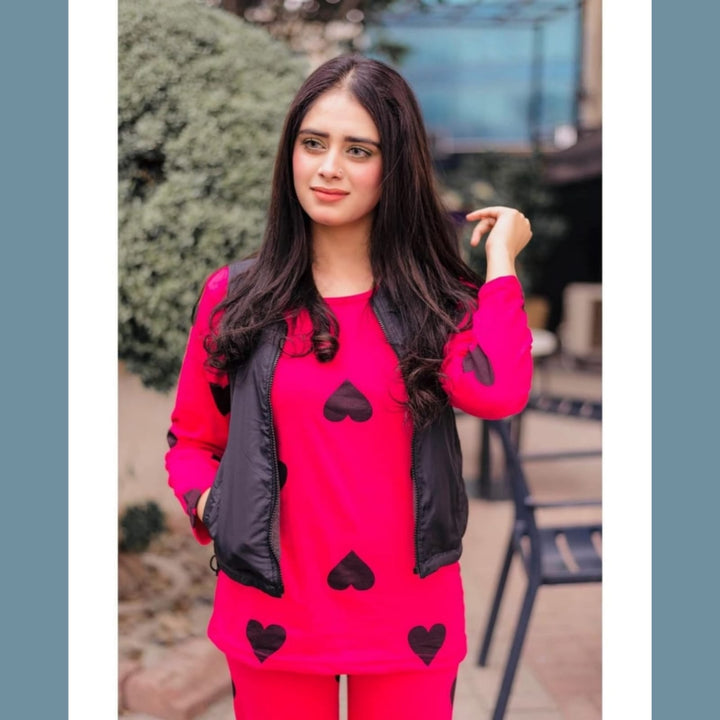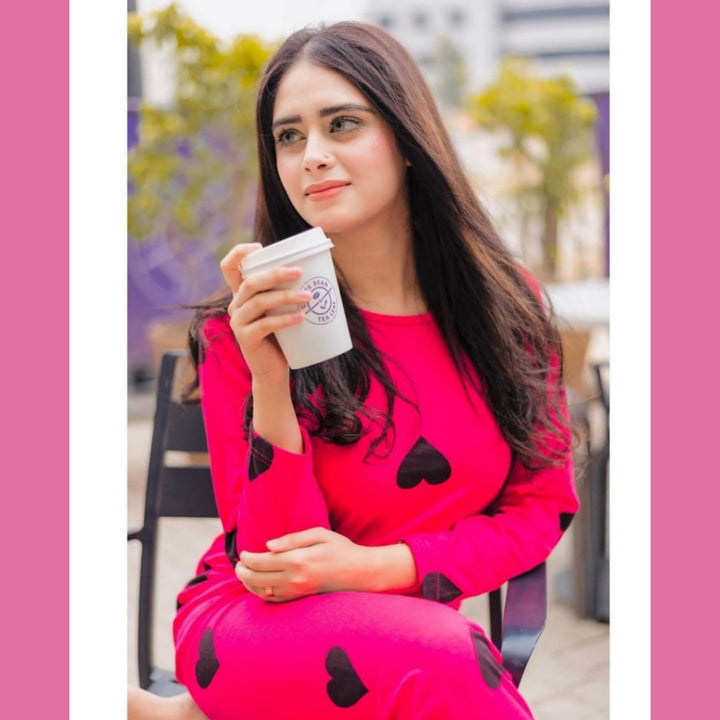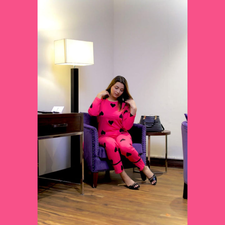 Shocking Pink With Black Big Heart print Full Sleeves Night Suit for her (AA-31)